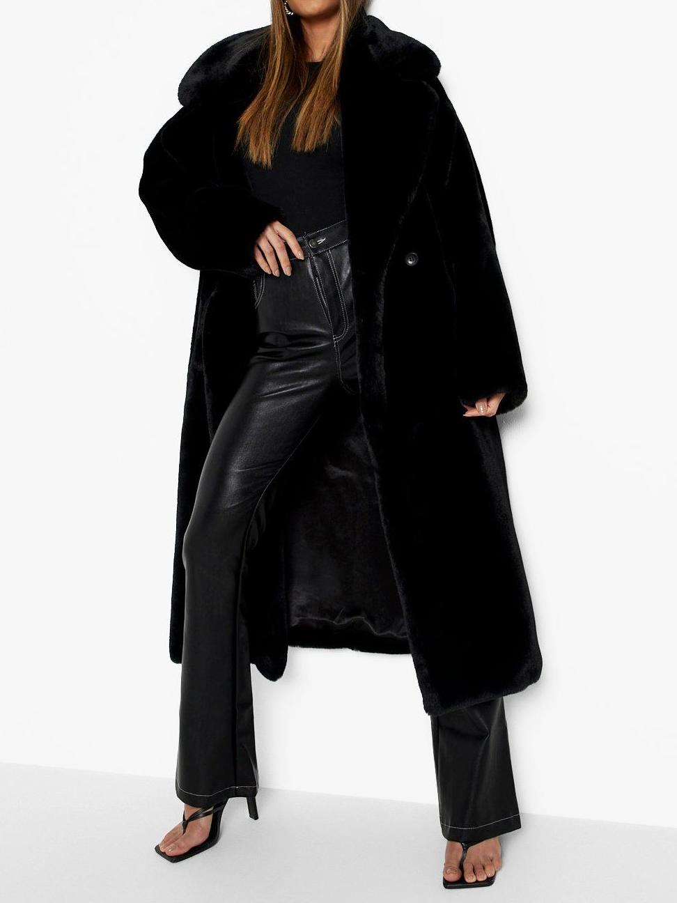 Feel sexy this season in this faux fur coat, made to look and feel as luxurious as animal fur without any animals harmed.Whether you're rocking your fave skinny jeans or a statement mini dress, this fur jacket has you covered (literally!). Wrap up snug with your faux fur fit, a chunky scarf, and a matching beanie for an outdo that wows.